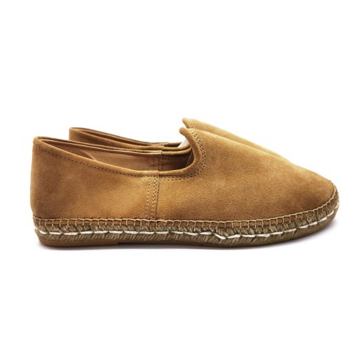 Veneciana caballero plana de yute tostado e hilo crudo, forrada en piel, con plantilla de vacuno y tejido en piel serraje cuero. Suela 100% ecológica.